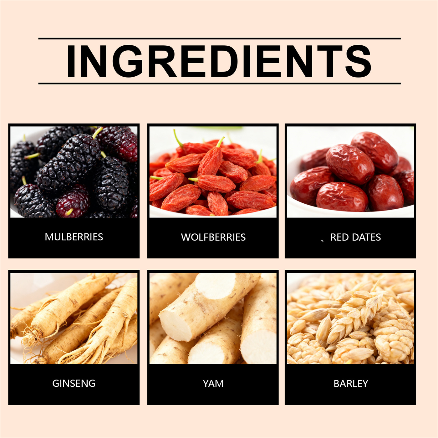 Ingredients: Mulberry, Lycium barbarum, Jujube, Ginseng, Yam and Barley.